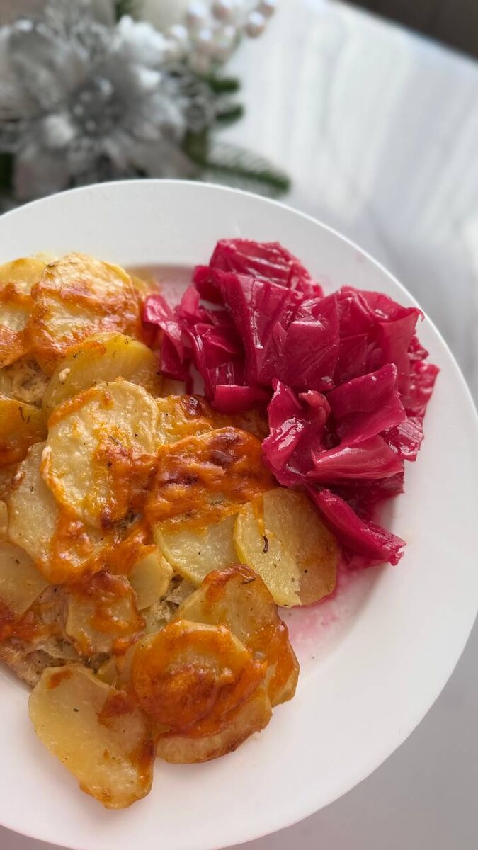 Здесь я не использую майонез, мне вкуснее с сочнее с сырным соусом. Готовлю его сама. Нам понадобится: Масло слив./гхи - 20 гр. Мука - 20 гр. Молоко - 500 гр. Сыр (у меня чеддер)- 100 гр. Соль, специи по вкусу ✔️ В кастрюле растопите сливочное масло, на маленьком огне! ✔️ Добавьте к маслу муку, перемешивая лопаткой или венчиком, понемногу начните добавлять молоко. ✔️ Увеличьте огонь до среднего, продолжая помешивать соус. ✔️ Доведите до однородной консистенции (если комочки не растворяются, процедите через сито, и снова на плиту). ✔️ Добавьте сыр, соль и специи, а затем еще несколько минут на слабом огне поварите соус до загустения. Остудите. Я смазываю соусом мясо и всё слайсы картошки перемешиваю с соусом. Выкладываю на мясо. Получается сочно и очень вкусно, пробуйте. Люблю такое с крепким, сладким чаем без молока. Использую в качестве подсластителя жидкую стевию.