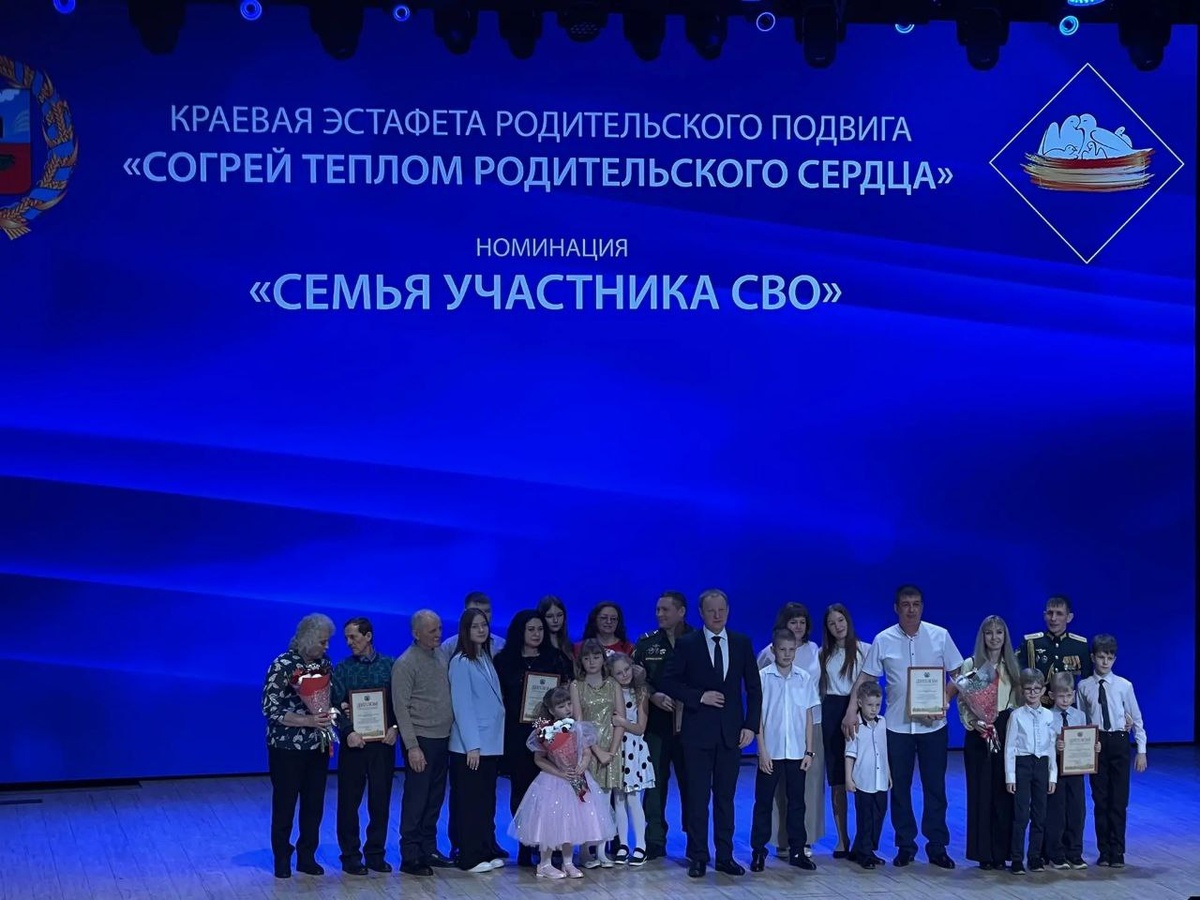 Получатели социальных услуг - многодетные семьи участников СВО и директор Центра социальной реабилитации инвалидов и ветеранов боевых действий приняли участие в краевом торжественном мероприятии - эстафете родительского подвига "Согрей теплом родительского сердца". В рамках мероприятия состоялось чествование 35 многодетных семей Алтайского края. Губернатор Алтайского края Виктор Петрович Томенко вручал памятные подарки семья, победившим в каждой из 6 номинациям: «Многодетная семья»; «Молодая семья»; «Сельская семья»; «Золотая семья»; «Семья – хранитель традиций», «Семья участника специальной военной операции». Данное мероприятие направлено на укрепление статус семьи, повышению её престижа, пропаганде ценностей материнства и отцовства.