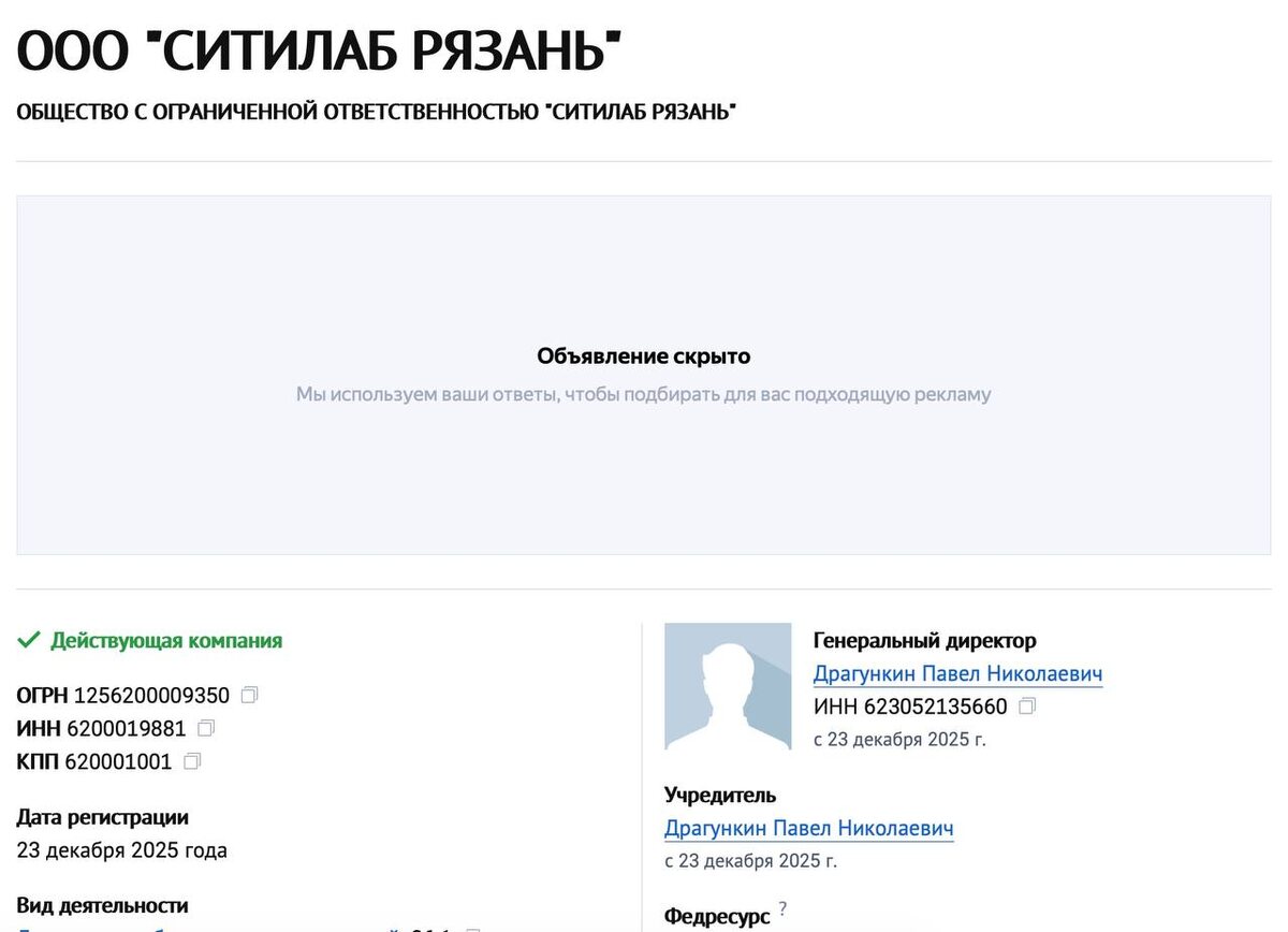 ? «Лёд тронулся, господа присяжные заседатели, лёд тронулся!» к/ф 12 стульев После многочисленных публикаций в СМИ @ryazanvkur...) про липовые печати и предположения о налоговых махинациях великий комбинатор Павел Николаевич Д. решил, видимо, не спасать ООО «МЕДКЛИНИКА», а оставить всё на откуп органам правопорядка под ответственность учредителя и с недавнего времени директора Каспрук Гилюзы Сайфуровны, управленческому таланту которой можно только позавидовать. Так, по словам сотрудников организации, её даже никто никогда не видел, однако клиника успешно развивается, оплачивая кабальные договора ИП Драгункину П. Н., который зарегистрировал ИП в Элисте и мечтает жить за границей и, возможно, выводит туда накопленные от неуплаты налогов богатства. Пока сотрудники организации готовятся давать показания, а некоторые уже дали, Павел регистрирует 23 декабря 2025 г. ООО «СИТИЛАБ РЯЗАНЬ» которое, предположительно, и есть тот самый перевалочный пункт, куда на время банкротства и, возможно, след