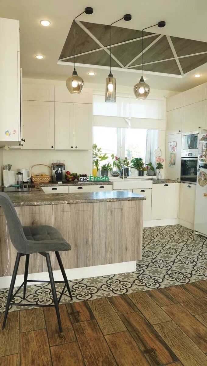 И бывают такие тонкие нюансы, которые буквально отравляют радость от использования нового гарнитура. Например как в этой кухне: вроде бы все у нее очень хорошо: много пространства, удобное хранение, П-образная форма, да и принцип золотого треугольника соблюден - казалось бы, что еще нужно? Но после установки обнаружилось, что на кухне установлена плохо продуманная барная стойка, под которую не помещаются ноги. А так хочется сесть и попить утренний кофе именно в этом месте! Ведь оно как будто предназначено для уютных завтраков с семьей. Вот и этот рефреш начался с того, что хозяевам захотелось уже изменить ситуацию и улучшить устройство их кухни, а не только внешний вид. А о чем вы не подумали при заказе кухни и теперь жалеете?