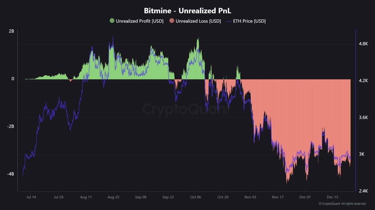 🔸Согласно данным CryptoQuant, Bitmine имеет нереализованные убытки в размере $3,5 млрд от своих инвестиций в ETH.