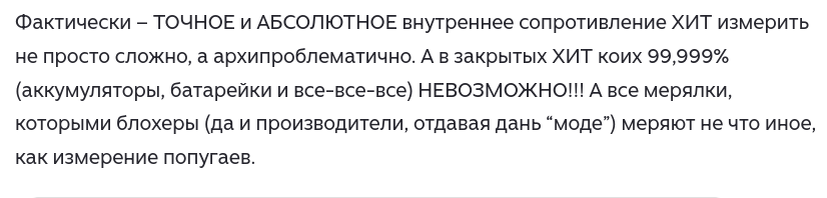 Их ошибка в том, что они подходят к аккумулятору как к резистору, пытаясь найти у него сопротивление как некую константу. Ведь резистор имеет более или менее постоянное сопротивление в широком диапазоне частот, токов и напряжений. Отсюда и выводы, что измерить внутреннее сопротивление аккумулятора невозможно, что всякие блоггеры измеряют мерялками, да и вообще всю эту модную ересь придумали маркетологи. Ведь каждый знает, что весь вред от маркетологов, а сопротивление это нечто постоянное. :)
