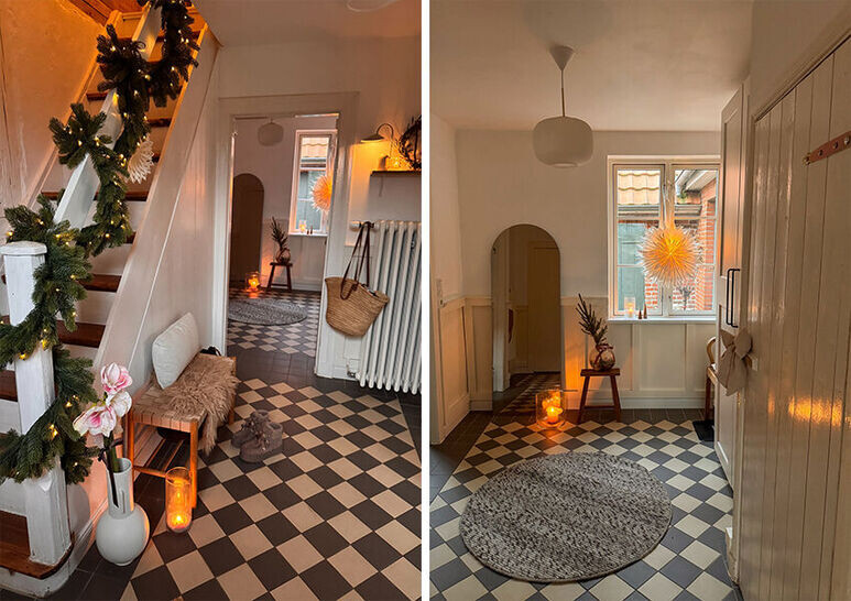 Дом Нины находится в Германии, но внутри царит Скандинавия. Этот современный интерьер в стиле хюгге наполнен уютом. Да таким, что осталось только елочку поставить и праздновать Новый год! Предлагаю отправиться на прогулку по дому, чтобы словить рождественское настроение. Входная группа небольшая: крошечная прихожая и лестница на второй этаж, которая украшена елочными ветками. Рядом — скамья, чтобы удобнее было переобуваться. За прихожей следует коридор с вместительным белым шкафом, чтобы повесить верхнюю одежду. То тут, то там видим множество стильных деталей, они забавно контрастируют с «шахматным» полом (кажется, это метлахская плитка — все-таки мы в Германии). Движемся дальше и попадаем в гостиную. Самое интересное тут — камин. Он необычной формы и отделан контрастным черно-белым металлом. Выглядит роскошно — резко захотелось увести такой на дачу. Недалеко находится диванная группа в цвете 2026 года по версии Pantone — «Облачный Танцор». Отличный пример того, как можно вписать модны