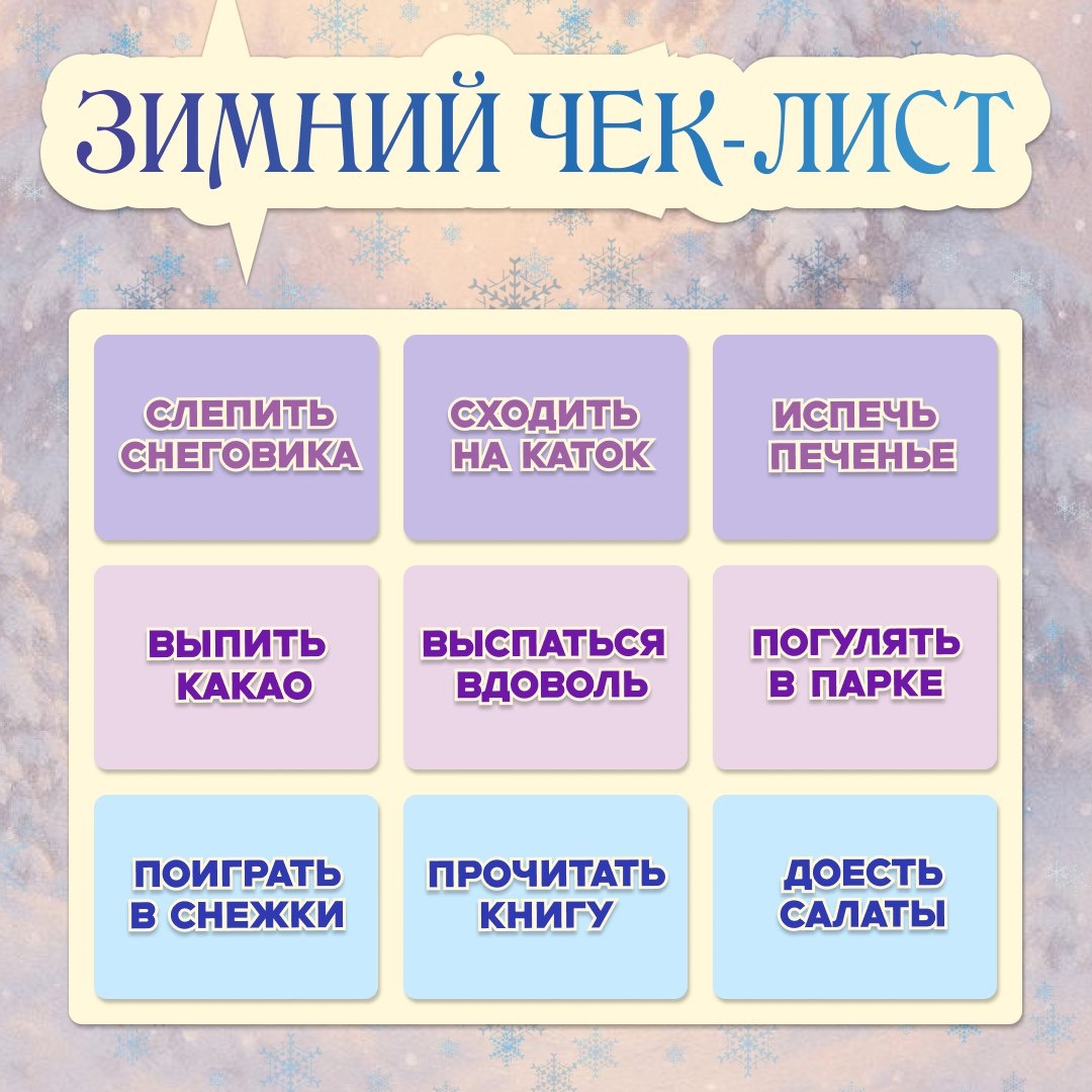 ✨⛄️Впереди долгие январские выходные — самое время составить уютный зимний план. Выбирайте пункты, которые добавите в свои планы.