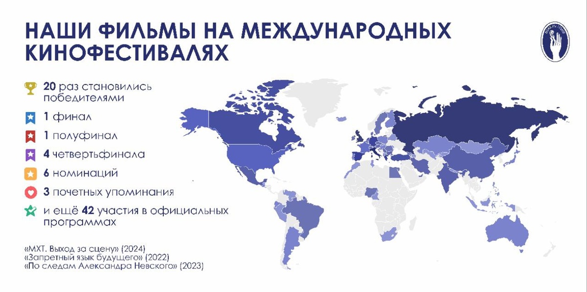 ! 🗺️ Мы решили подвести небольшой итог нашей работы за последние два года. На слайде можно увидеть результаты и географию нашего участия в более чем 70 кинофестивалях. 📊 Представлена статистика участия трех наших работ: «Запретный язык будущего» / «Forbidden Language of the Feature» (2022) «По следам Александра Невского» / «In the Footsteps of Alexander Nevsky» (2023) «МХТ. Выход за сцену» / «Chekhov. Offstage» (2024) 🖱 Фильмы представлены на международных киноплатформах IMDb и Rotten Tomatoes.
