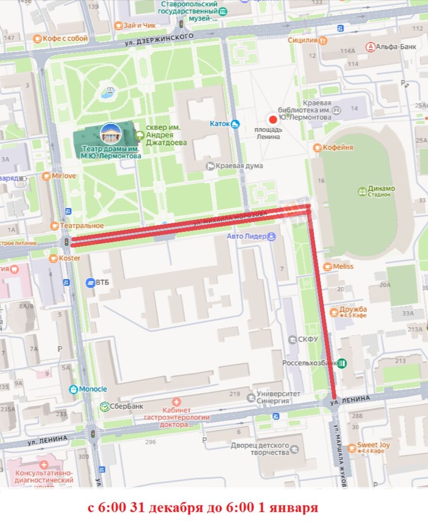В Ставрополе временно ограничат движение на некоторых улицах в новогоднюю ночь, на Рождество и Крещение, предупредили в пресс-службе городской администрации. В период перекрытий не будут ездить троллейбусы № 1, 2, 4, 9, 13. Запланированы перекрытия: с 6:00 31 декабря до 6:00 1 января: ул. М. Морозова (от Артема до Маршала Жукова); ул. Маршала Жукова (от Ленина до Дзержинского). Объезд по улице Ленина, Артема, Дзержинского, проспекту Октябрьской Революции, проспекту К. Маркса. с 20:00 31 декабря до 6:00 1 января: ул. Артема (от Ленина до Дзержинского); ул. М. Морозова (от Пушкина до Артема); ул. Дзержинского (от Пушкина до К. Хетагурова); пр-кт Октябрьской Революции (от Дзержинского до Советской); ул. Суворова (от Советской до Ставропольской); пр-кт К. Маркса (от Голенева до проспекта Октябрьской Революции); ул. Советская; ул. Булкина; ул. Кавалерийская (от Дачной до Дзержинского); пр-кт Российскому (от Западного обхода до Тухачевского); ул. Ивана Щипакина; ул. Генерала Маргелова; ул. М