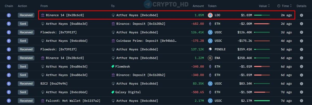 🤑 Артур Хейс купил 1,850,000 #LDO ($1m) – кошелек