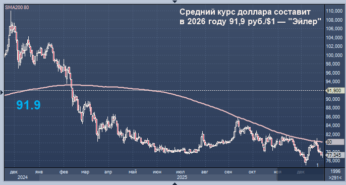 Средний курс доллара составит в 2026 году 91,9 руб./$1 — "Эйлер" Курс доллара к рублю расчётный, фьючерс, вечный фьючерс и межбанк. Курс евро к рублю расчётный, фьючерс, вечный фьючерс и межбанк. Курс юаня к рублю биржевой, фьючерс, вечный фьючерс и межбанк. Средний курс доллара составит в 2026 году 91,9 руб./$1, говорится в материале аналитической компании "Эйлер". По мнению аналитиков, на курс рубля в 2026 году будут влиять следующие факторы: - Сокращение продаж валюты вне бюджетного правила, оно будет дискретным и пройдет в два этапа. В начале года выпадут продажи, связанные с зеркалированием использования ФНБ на расходы бюджета вне бюджетного правила, в результате чего продажи валюты снизятся c текущих 8,9 млрд руб. в день до 4,6 млрд руб. в день. Эксперты полагают, что во 2П26 объем продаж валюты в рамках нерегулярных операций с большой вероятностью уменьшится дополнительно (примерно на 2 млрд руб. в день), т.к. Минфин со следующего года планирует заметно снизить объем инвестиций