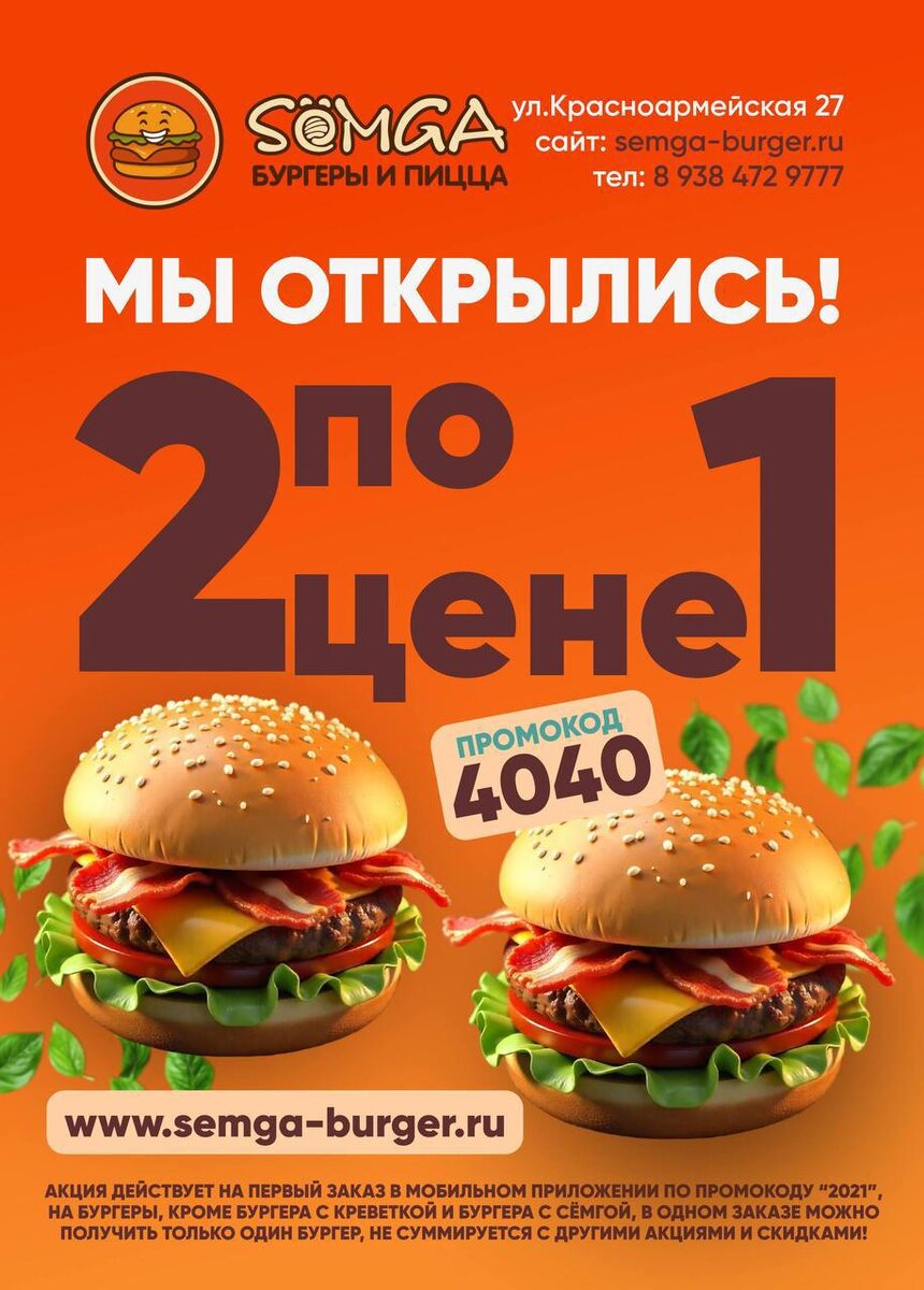 😱🍔 2 БУРГЕРА по цене 1 ШОК Акция в честь открытия ❗️ Целых 2 🍔🍔по цене 1 🍔 Промокод: 4040 Новая доставка бургеров и пиццы от Sëmga 🧡 🍕 МЫ УЖЕ ОТКРЫТЫ 🔥 📍Ул. Красноармейская 27 Доступна доставка и самовывоз *акция действует при первом заказе через наше приложение *в одном заказе можно получить один бургер Скачать тут 👇🏼 AppStore RuStore А в нашем телеграм канале продолжается большой РОЗЫГРЫШ🎁 5-ти фирменных сетов от Sëmga подписывайся и участвуй ☺️@semga_su_sochi