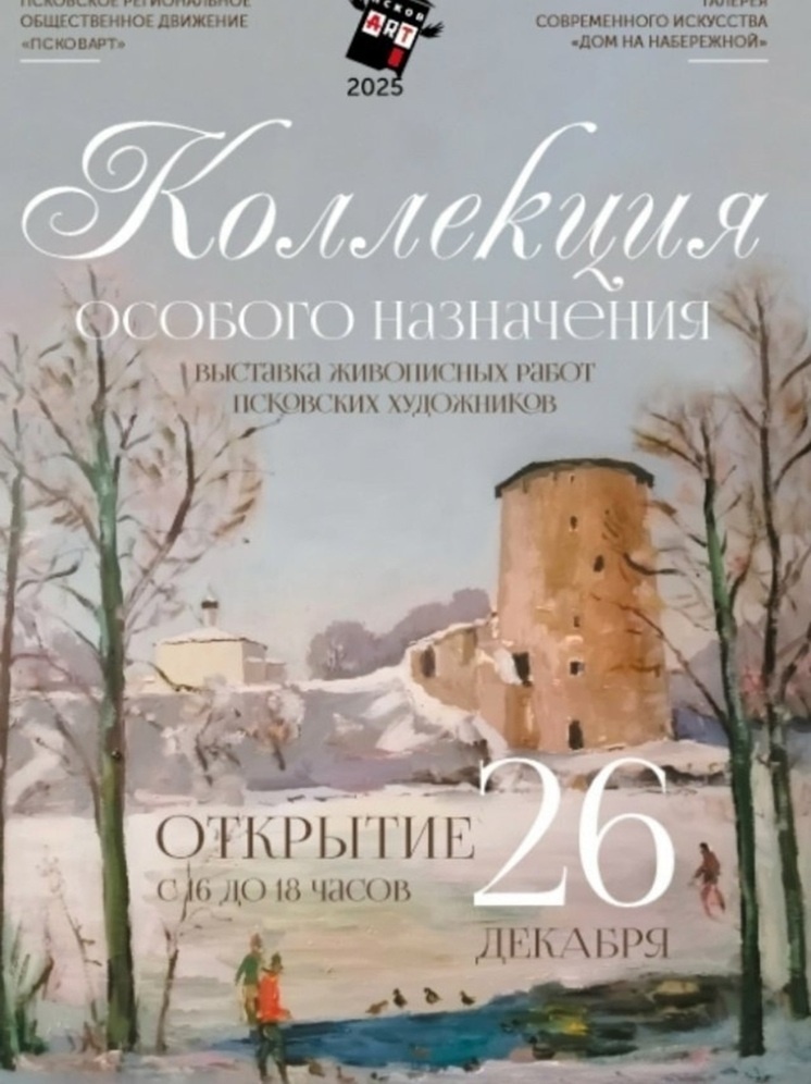 26 декабря в псковской галерее современного искусства «Дом на набережной» откроется групповая выставка живописи «Коллекция особого назначения». На ней будут представлены около 50 работ из личных коллекций тринадцати псковских художников. Об этом "МК в Пскове" сообщили в Центре туризма и творческих индустрий Пскова. Экспозиция включает произведения разных жанров и периодов: пейзажи, натюрморты и абстрактные композиции. Как отмечают организаторы, выставка является для авторов способом подвести творческие итоги и показать зрителям свой внутренний мир, эмоции и впечатления. Многие работы вдохновлены природой и видами Псковского края. В выставке участвуют известные местные художники: Юлиана Голубева, Ольга Гофман, Галина Дячок, Анатолий Жбанов, Юрий Жулин, Сергей Каримов, Олег Матюхин, Николай Москалев, Ираида и Николай Самойленко, Тимофей Силич, Виктор Тимофеев и Эдуард Шарипов. Торжественное открытие состоится 26 декабря в 16:00 по адресу: г. Псков, Советская набережная, 9. Выставка будет