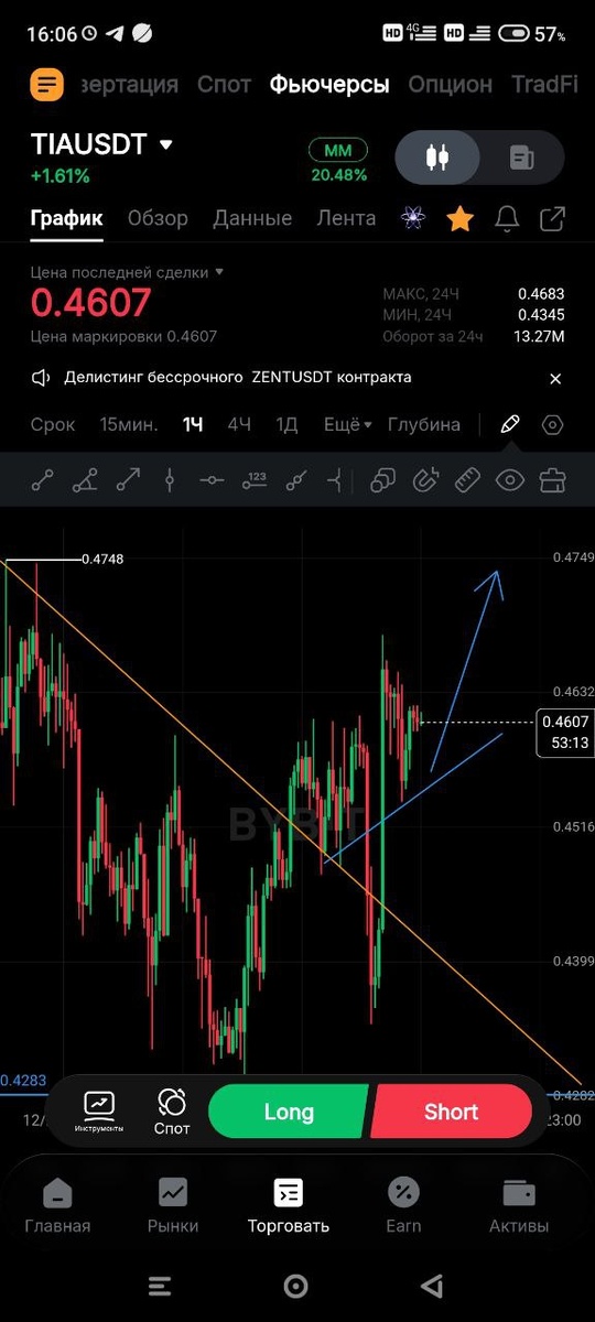 Монета TIA, вышли за зону сопротивления. Фигура перевернутая голова и плечи. От зоны буду брать позицию в Лонг.