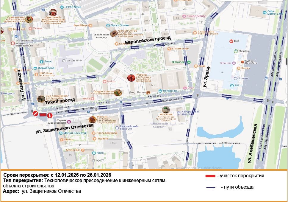 Защитников Отечества В период с 12 по 26 января 2026 года в связи с выполнением строительно-монтажных работ планируется прекратить движение транспортных средств на автомобильной дороге ул. Защитников Отечества в районе перекрестка с ул. Газовиков. Участников дорожного движения просим обращать внимание на дорожные знаки, заранее планировать маршрут движения, соблюдать Правила дорожного движения РФ. Возможные маршруты объезда: ул. Алебашевская, ул. Газовиков, проезд Европейский. Департамент дорожной инфраструктуры и транспорта