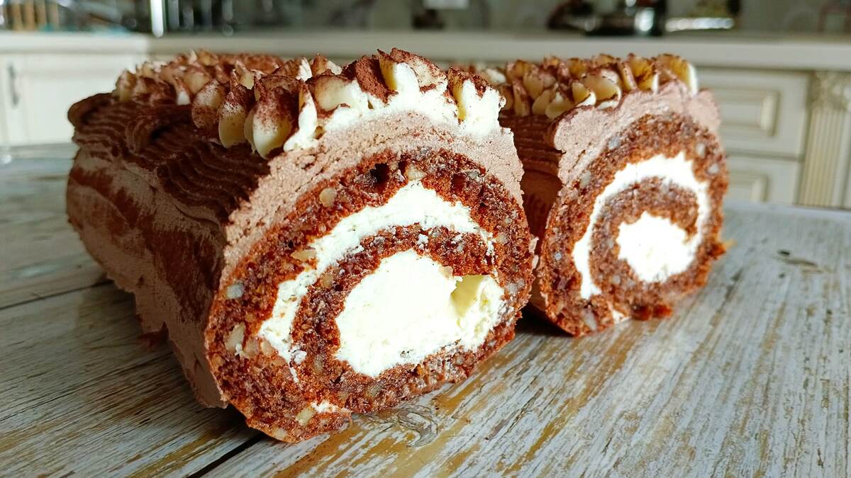 Осторожно закручиваю ореховый бисквит с кремом Шарлотт в рулет.