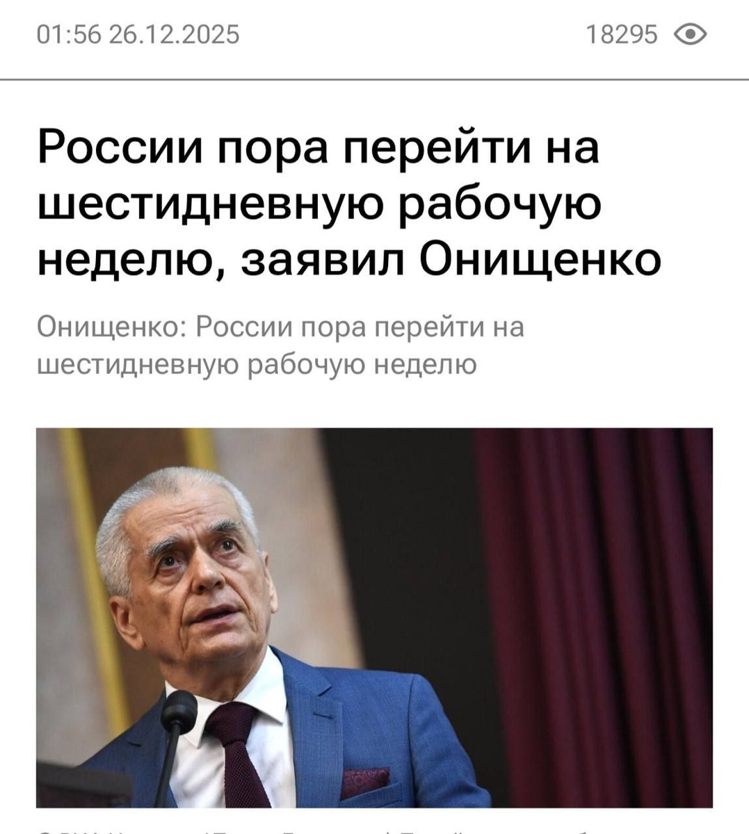 ⏺Россиянам пора перейти на шестидневную рабочую неделю, на здоровье это никак не скажется, — академик РАН, заместитель президента Российской академии образования Геннадий Онищенко