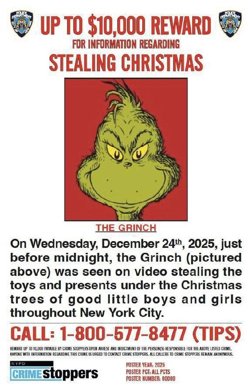 Полиция Нью-Йорка объявляет о вознаграждении в $10 000 за информацию о местонахождении мистера Гринча 🎄