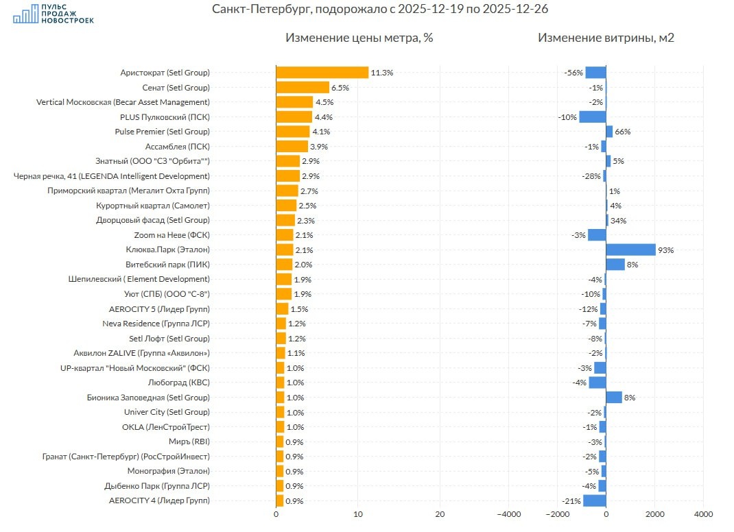 💰 Смотрим без премиум и элит классов. 💵 За 7 дней цена метра выросла на 0.4% до 314 400 рублей за метр. 📈Топ изменения цен (подорожало): 1️⃣ЖК "Аристократ" (Setl Group) цена метра +11.3%, витрина предложения уменьшилась на -852м2 2️⃣ЖК "Сенат" (Setl Group) цена метра +6.5%, витрина предложения уменьшилась на -10м2 3️⃣ЖК "Vertical Московская" (Becar Asset Management) цена метра +4.5%, витрина предложения уменьшилась на -29м2 🪫Анти топ (подешевело): 1️⃣ЖК "ЦДС «Чёрная речка»" (ЦДС) -4.3% в цене, объем витрины при этом увеличился на 453м2 2️⃣ЖК "SETL Ривьера" (Setl Group) -3.8% в цене, объем витрины при этом увеличился на 2397м2 3️⃣ЖК "Полет" (Стоун) -3.2% в цене, объем витрины при этом увеличился на 1516м2 ☄️Объем предложения жилья в регионе ниже -1.0% (-12540 м2) Все изменения в регионе на картинке. ‼️Только для наших подписчиков в телеграмм - сервис истории цен для поиска выгодных предложений и аналитики по проектам ПИК https://hist.pulsprodaj.ru/ 🔥 @pulsprodaj