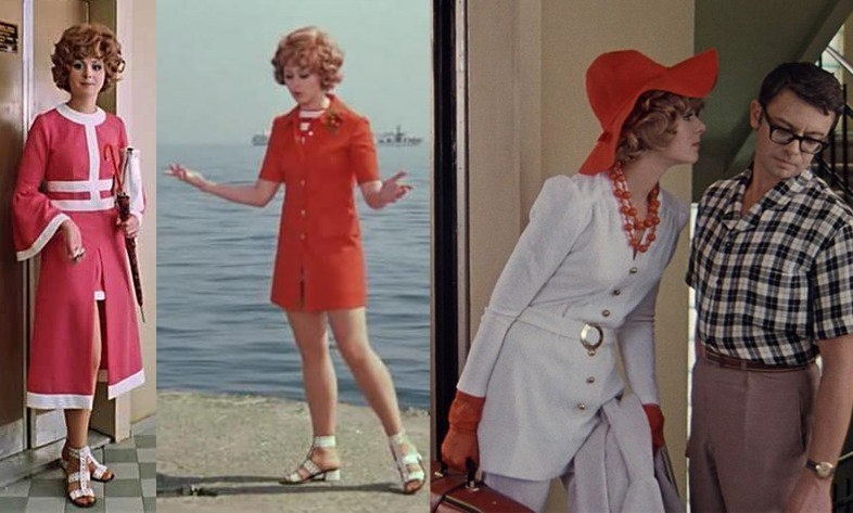 Первый наряд — красное платье с геометрическим узором, вдохновлённое работами Пьера Кардена. Второй — белый брючный костюм, покоривший сердце самодержца. Третий — платье, в котором Зиночка снималась на берегу моря, завершил её образ.
