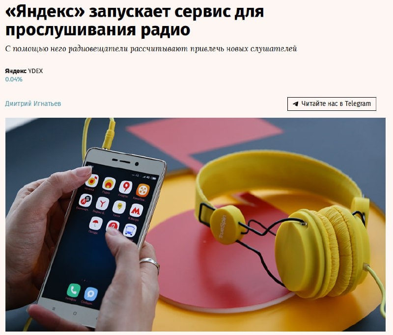 Академия Радио. Цифровой гигант нашёл возможность помогать радиовещателям и зарабатывать на этом В магазинах мобильных приложений Google Play и AppStore появился сервис «Яндекс.Радио», обнаружил корреспондент «Ведомостей». Как пояснил представитель «Яндекса», это бета-версия разработанного компанией сервиса для прослушивания эфира радиостанций. Сейчас в нем представлено более 300 вещателей, в том числе крупнейших российских радиохолдингов – «Европейской медиагруппы» (ЕМГ), «ГПМ радио» (входит в холдинг «Газпром-медиа») и «Русской медиагруппы» (РМГ), уточнил он. Сервис уже доступен как в мобильной, так и в веб-версии. Платформа будет бесплатной для пользователей, монетизировать контент вещателей планируется за счет рекламы, пояснил представитель «Яндекса». По его словам, «Яндекс» интегрирует в сервис платформу компании для автоматической закупки размещений рекламы. Рекламодатели смогут продвигать в «Яндекс.Радио» свои товары и услуги через форматы на стыке «FM-потока и онлайн-трансляц