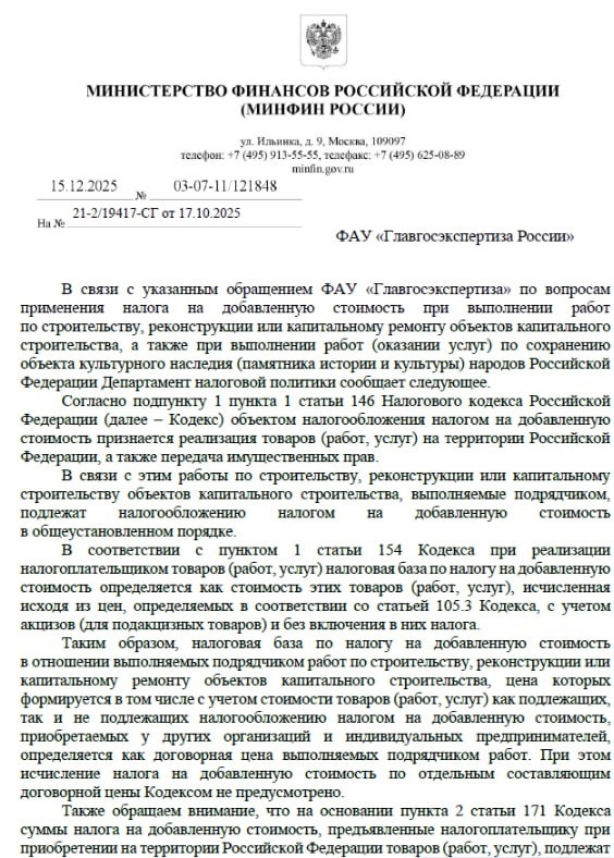 ⚡️ Во ФГИС ЦС 25 декабря размещено разъяснение Минфина России по вопросам Главгосэкспертизы включения в налоговую базу по НДС стоимости товаров (работ, услуг), приобретаемых в целях реализации (исполнения контракта) работ по строительству, реконструкции или капитальному ремонту ОКС на территории РФ, а также по вопросу исчисления и уплаты НДС при приобретении товаров (работ, услуг) в целях реализации (исполнения контракта) работ (услуг) по сохранению ОКН РФ 📀 Скачать разъяснение ➡️Об учете НДС в сметной документации #НДС