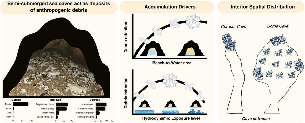 🌊🛰️ Ключевые факты исследования: 🔘Рекордное загрязнение: У побережья Кипра исследователи изучили 23 пещеры и обнаружили плотность мусора до 100 тысяч фрагментов на квадратный метр. Это один из самых высоких показателей загрязнения, когда-либо зафиксированных в океане. 🔘Причина накопления: Из-за замкнутой формы пещер мусор, попавший внутрь с волнами, не может вымыться обратно. Пещеры превращаются в «ловушки» или резервуары для отходов. 🔘Состав мусора: 66% находок составляет пластик, большая часть которого имеет морское происхождение (результат рыболовства и судоходства). Также найдены «пластигломераты» – пластик, спекшийся с природными отложениями на стенах пещер. 🔘Угроза для животных: В этих пещерах обитают редчайшие тюлени-монахи, находящиеся под угрозой исчезновения. Для них пещеры – единственное убежище, и загрязнение напрямую угрожает их жизни. ✅ Итог: Труднодоступные морские экосистемы, которые раньше считались защищенными, на самом деле являются «горячими точками» нак
