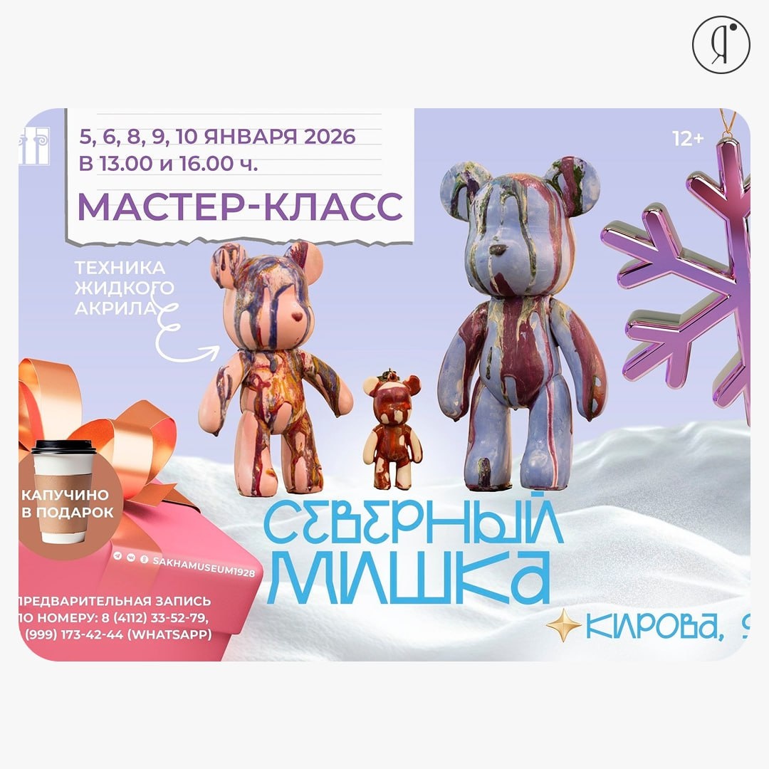 + #МК #Детям Музей предлагает мастер-класс по росписи дизайнерской фигуры, вдохновленной мотивами произведения «Большая медведица» якутского художника-графика Азалии Соргоевой из фондов музея. Украшать фигурки будете в технике жидкого акрила, создавая цветовые подтеки и яркие эффекты под руководством профессионального художника ☕️Всех участников ждет приятный бонус - кофе капучино в подарок! 5, 6, 8, 9, 10 января | 13:00 | 16:00 НХМ РС (Я), Кирова, 9 900-2500 руб. 8 (4112) 33-52-79 Online Якутия | Ждем вас в МАХ