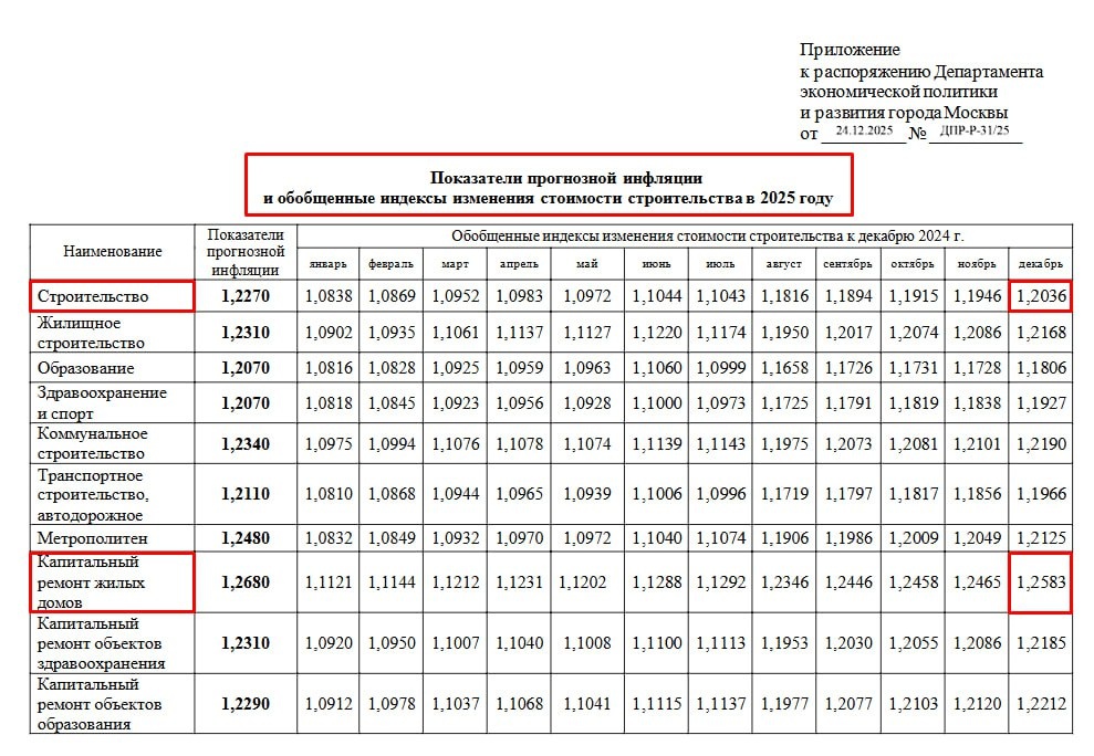 ⚡️⚡️⚡️Распоряжение Департамента экономической политики и развития города Москвы от 24.12.2025 № ДПР-Р-31/25 «Об утверждении обобщенных индексов изменения стоимости строительства» Департамент экономической политики и развития города Москвы обновил Показатели прогнозной инфляции на ДЕКАБРЬ 2025: ✔️ Инфляция по Строительству в целом -20,36% ✔️Инфляция по Капитальному ремонту жилых домов - 25,83% 📱ТСН-2001 и ГРАНД-Смета