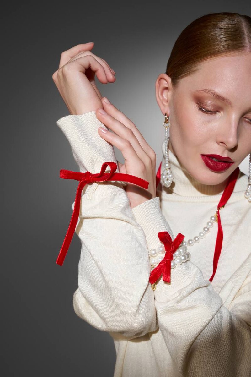 Комплект дополняют изящные браслеты из жемчуга в сочетании с бархатной красной лентой, которые добавляют женственности и