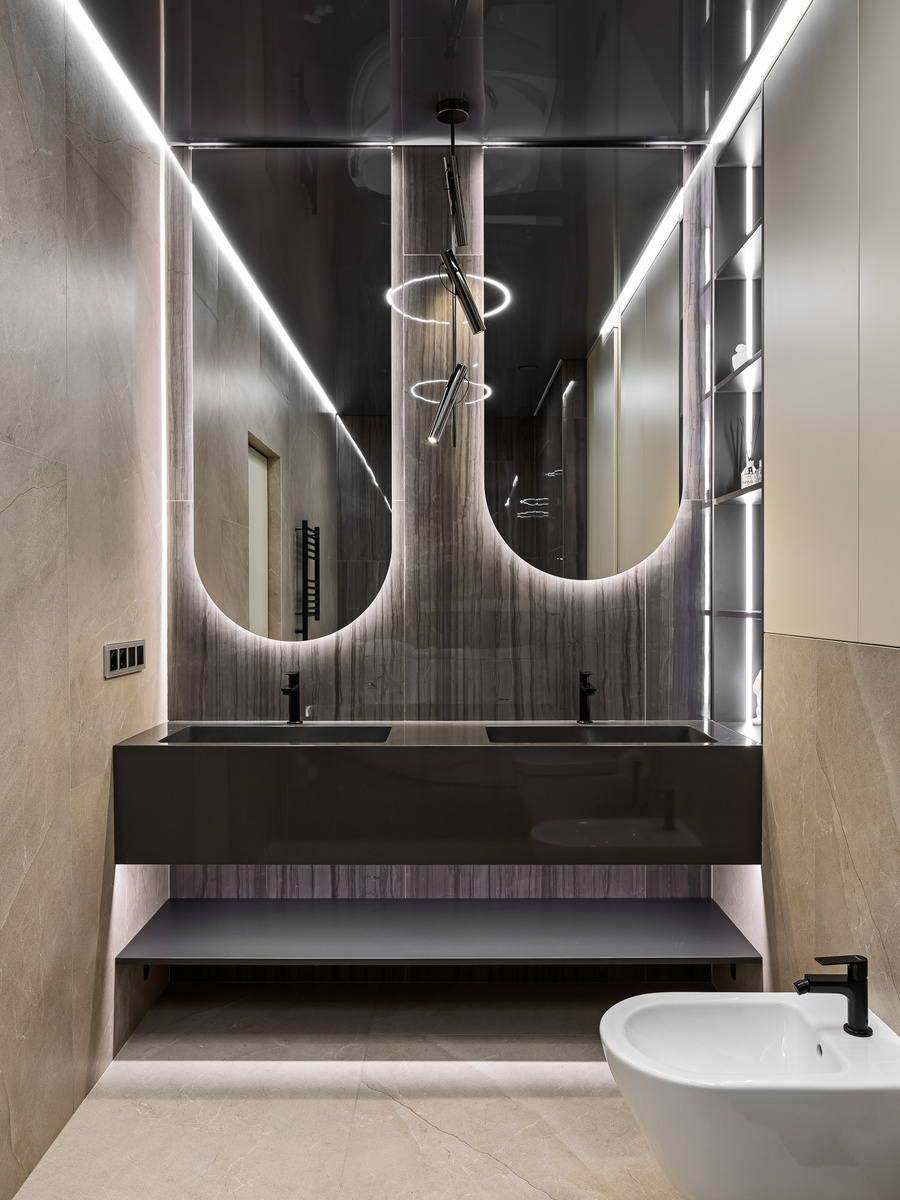 Дизайнер Светлана Антипина взялась за непростой, но увлекательный проект — создать гармоничное пространство для молодой семьи из четырёх человек. Заказчики чётко обозначили свои пожелания, что заметно ускорило согласование концепции. В целом работа — от первых эскизов до финального штриха — заняла около девяти месяцев. Особую сложность представляли монолитные несущие стены: они исключали возможность перепланировки, и потому требовалось особенно тщательно продумать зонирование. Главная задача состояла в том, чтобы учесть разный ритм жизни домочадцев и организовать для каждого индивидуальное функциональное пространство с оглядкой на его характер и увлечения. В санузлах удалось совместить практичность и комфорт. В основном разместили двойную раковину и угловую ванну‑джакузи — идеальное решение для утренних ритуалов всей семьи. Во втором санузле оборудовали душ с хромотерапией и интегрировали зону для стирки, добившись максимальной функциональности. Прихожая благодаря зеркальному панно зри