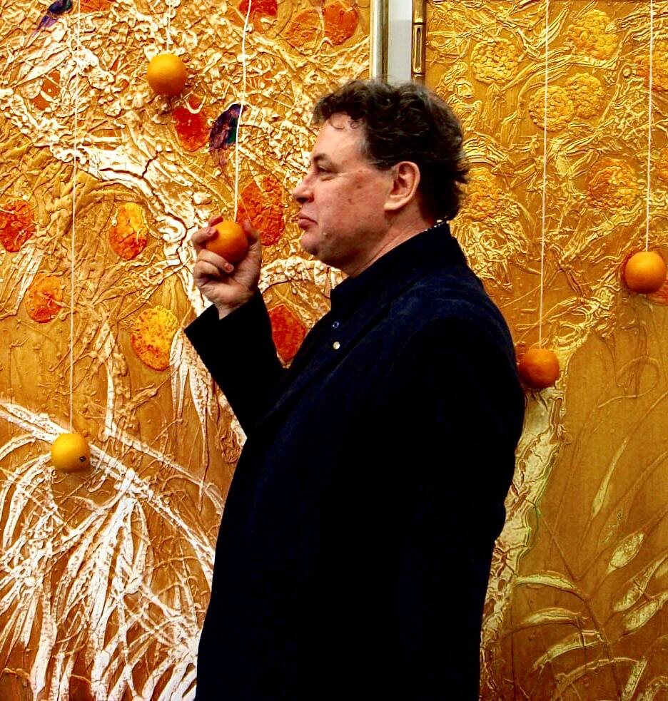 Войдя в мастерскую к Евгению Турунову, ты попадаешь в яркий, экзотичный мир: роскошные цветы, величественные павлины, золотые драконы, летающие рыбы... А повыше на стене представлена другая сторона творчества художника — виды тёмного, старого, депрессивного города, в таинственных улочках которого можно потеряться. Сам Евгений Орестович тоже имеет два лица. Один — любящий удачно пошутить, артистичный, насмешливо-ироничный. Ему в пору играть какого-нибудь эстетствующего барона или купца в соболях и с цыганами. Другой — печальный и философичный. «Культуре 38» Евгений Турунов рассказал об извилистом пути к живописи и идеальном мире, где художник может быть счастлив.