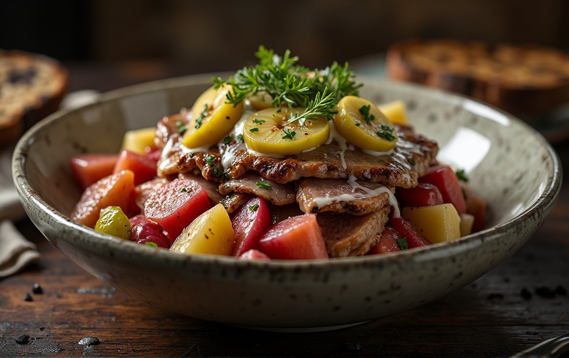 Это — пиршество после подписания мира между Севером и Югом, Морем и Полем, Бабушкиной памятью и современной холодильной техникой. А название? «Рейнский салат» — ну да, конечно. Как «Киевский торт» родом из Саратова, а «Московский борщ» впервые сварила тётя Зина из Одессы. Названия — это поэзия. А суть — в слоях. Как в жизни. Только вкуснее.