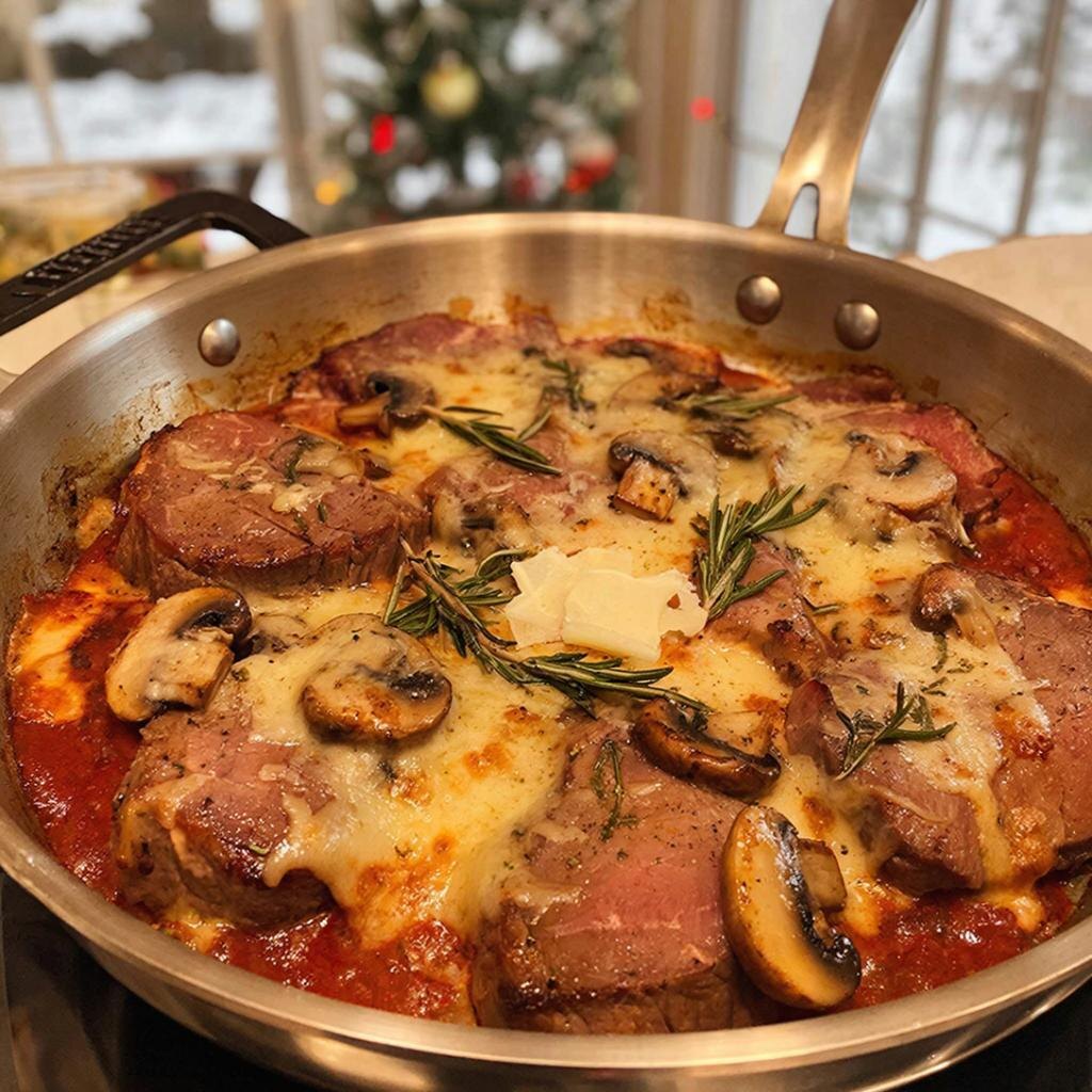 Ингредиенты: - Свинина (или говядина) — 800 г - Шампиньоны — 300 г - Сыр пармезан — 150 г - Белое сухое вино — 150 мл - Оливковое масло — 3 ст.л. - Чеснок — 3 зубчика - Розмарин свежий — 1 веточка - Томатная паста — 2 ст.л. - Черный перец молотый — по вкусу - Соль — по вкусу Подготовка мяса 1. Нарежьте мясо небольшими кусочками толщиной около 1 см. 2. Посыпьте кусочки солью и перцем. Обжаривание ингредиентов 1. Разогрейте оливковое масло в большой сковороде на среднем огне. 2. Добавьте нарезанные грибы и обжаривайте их до золотистого цвета. 3. Затем добавьте чеснок и розмарин, обжарьте ещё минуту. 4. Положите подготовленное мясо в сковороду и жарьте до румяной корочки. Запекание 1. Полейте мясо белым вином и дайте вину выпариться примерно наполовину. 2. Добавьте томатную пасту, перемешайте и тушите всё вместе минут 10-15. 3. Натрите сыр пармезан на крупной терке и посыпьте сверху готовое мясо. 4. Поставьте сковороду в предварительно разогретую духовку до 180°C на 10-15