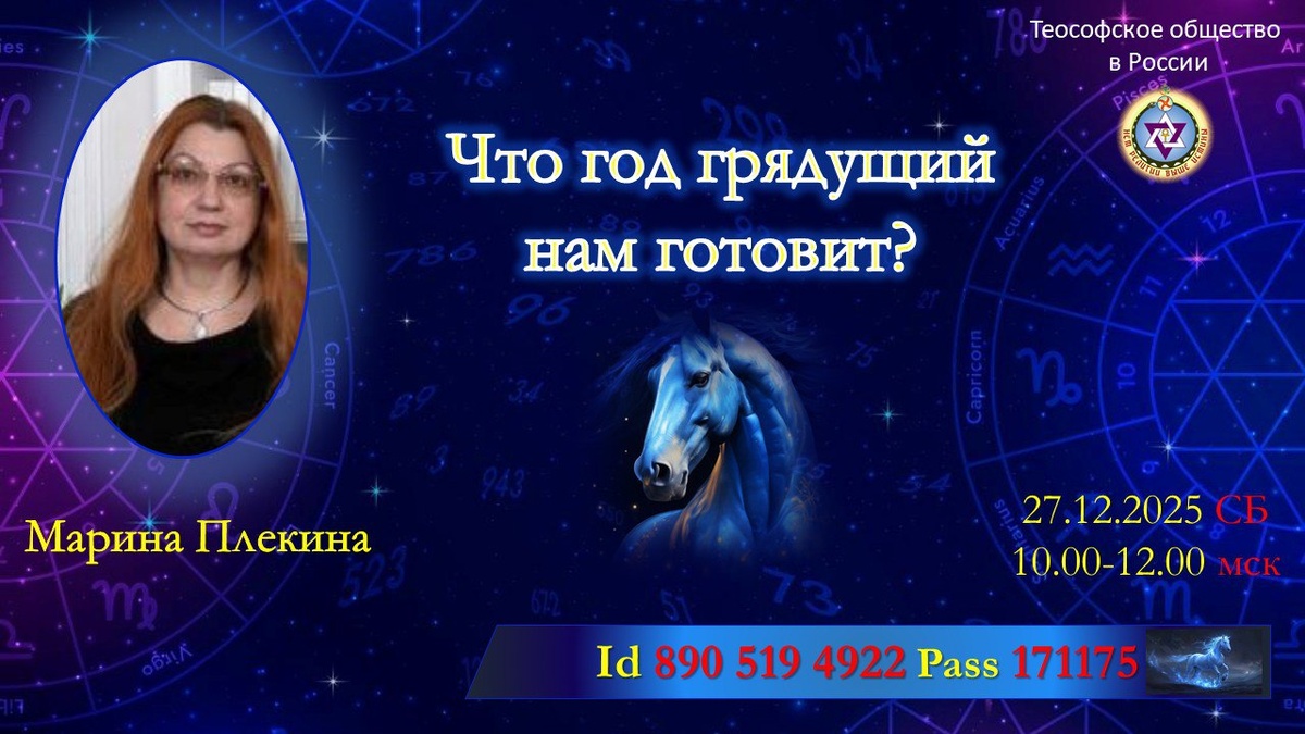 грядущий год🎉🎉🎉 🎄🎄🎄Быстрый вход в лекторий по ссылке: https://clck.ru/37Q6hC. ZOOM Id: 890 519 4922 Код: 171175 🎄🪷🌲СПИКЕР: Марина Вячеславовна Плёкина, профессиональный астролог, психолог, нумеролог, космоэнергет, г.Москва. Вход свободный. Регистрация и установка программ не нужны. Добро пожаловать на новые официальные каналы ТО в России: Телеграм: https://dzen.ru/id/65d660ee6ea3c03aedda47dd Дзен: https://dzen.ru/profile/editor/ts_russia Подписка на рассылку Теософского общества в России и по любым вопросам: secretary@ts-russia.org