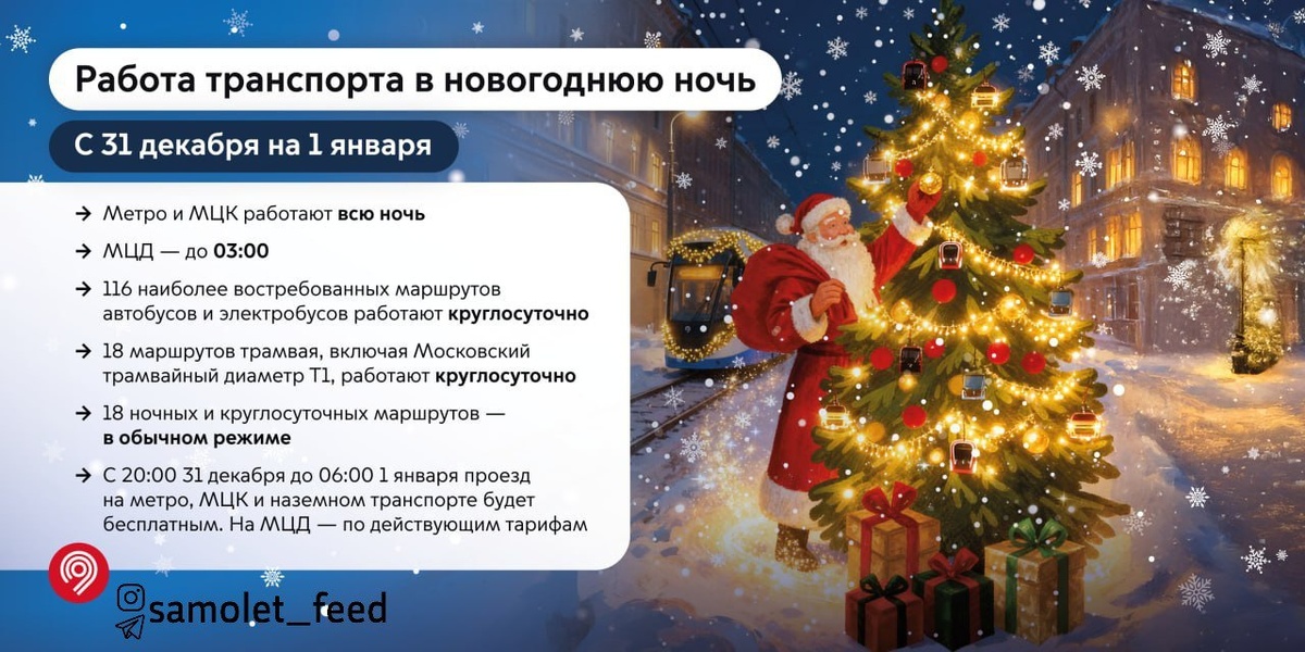 В ночь с 31 декабря на 1 января городской транспорт будет работать по особому графику, чтобы москвичи и гости столицы могли спокойно добраться домой, в гости и на праздничные мероприятия. В новогоднюю ночь: Метро и МЦК — круглосуточно; МЦД — до 03:00; Без перерыва будут курсировать 116 востребованных маршрутов автобусов и электробусов; Круглосуточно продолжат работу 18 трамвайных маршрутов, включая первый Московский трамвайный диаметр Т1; В обычном режиме продолжат работу все 18 регулярных ночных маршрутов. С 20:00 31 декабря до 06:00 1 января проезд на метро, МЦК и наземном транспорте будет бесплатным. На МЦД — по действующим тарифам. В метро организуют трансляцию новогоднего обращения Президента России. В Рождественскую ночь с 6 на 7 января: Метро и МЦК будут работать до 02:00; МЦД — до 03:00; Наземный городской транспорт — до 03:30 (125 автобусных и электробусных, 18 трамвайных маршрутов); 18 ночных маршрутов — в обычном режиме. Парковка в праздничные дни: С 31 декабр