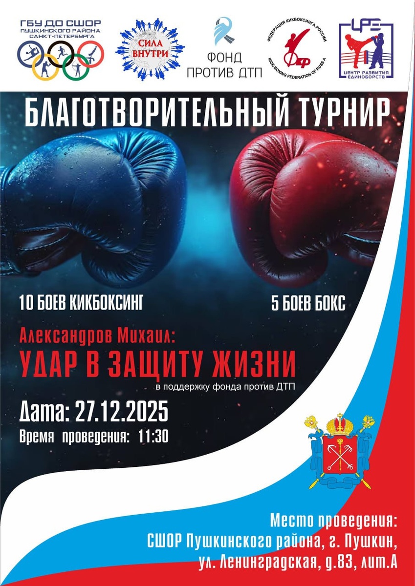 🥊 Благотворительный турнир «Удар в защиту жизни» Приходите на благотворительный турнир «Удар в защиту жизни»! 27 декабря в 11:30 в ГБУ ДО СШОР Пушкинского района (г. Пушкин, ул. Ленинградская, д.83, лит.А) пройдёт спортивное событие в поддержку Фонда против ДТП. 🥊 В программе — 10 боёв кикбоксинг и 5 боёв бокс. Поддержим важную инициативу и увидим захватывающие поединки от сильнейших спортсменов! 📅 Дата: 27 декабря 2025 🕚 Время: 11:30 📍 Место: ГБУДО СШОР Пушкинского района, г. Пушкин, ул. Ленинградская, д.83, лит.А Присоединяйтесь — вместе мы можем сделать шаг к безопасности на дорогах! #ГБУДОСШОРПушкинскогорайонаСанктПетербурга #Благотворительность #СпортПротивДТП