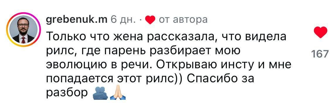 Я уже рассказывал, что начал делать разборы речи на YouTube. Возможно, многие из вас видели их. И, надеюсь, подписались на меня и там ✅ Разборы помогают увидеть нюансы в речи известных людей, посмотреть на динамику их развития. Сделал я ролик и по речи Михаила Гребенюка (в канале тоже есть про его речь пост). И в комментарии к моему ролику пришёл сам Михаил Гребенюк. Я, когда увидел комментарий, упал в обморок, а потом встал и прыгал от радости, почувствовал удовлетворение. Такое, знаете, спокойное: значит, не зря я всё делаю! Михаила я давно смотрю, многому у него научился. Для меня он в каком-то смысле удалённый наставник. И, конечно, по-человечески я рад и за его путь, и за его масштаб. ✔️ Его комментарий — классный и живой отклик от пространства на то, что я делаю. Если делаешь честно, системно и с любовью, это рано или поздно начинает работать. Наверное, это и есть главный ориентир. Делать свою работу хорошо — и идти дальше. 💬 Поделитесь, что делали в этом году, что было классног