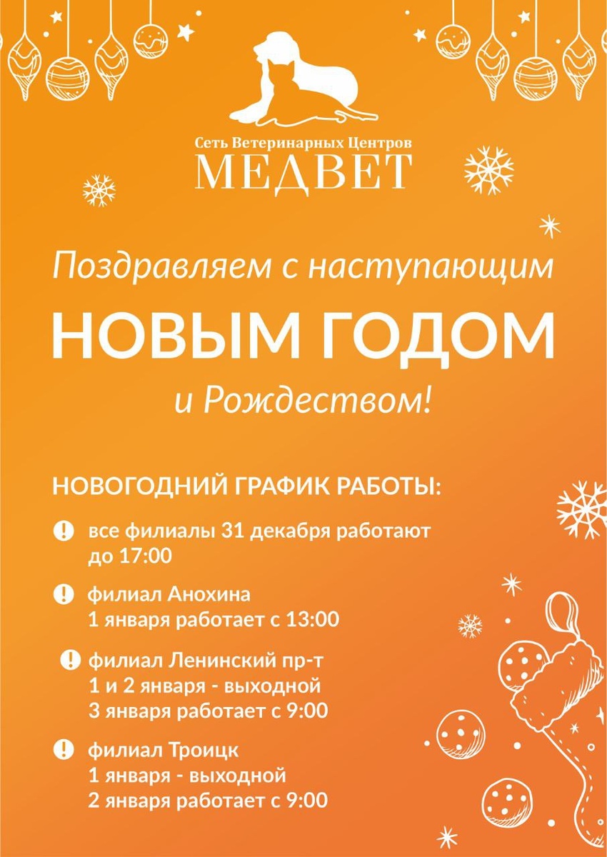 ❄️🎄⛄ Друзья, мы с вами и в будни, и в праздники! Сохраняйте график работы наших ветцентров в Новогодние каникулы. Здоровья вам и вашим питомцам!