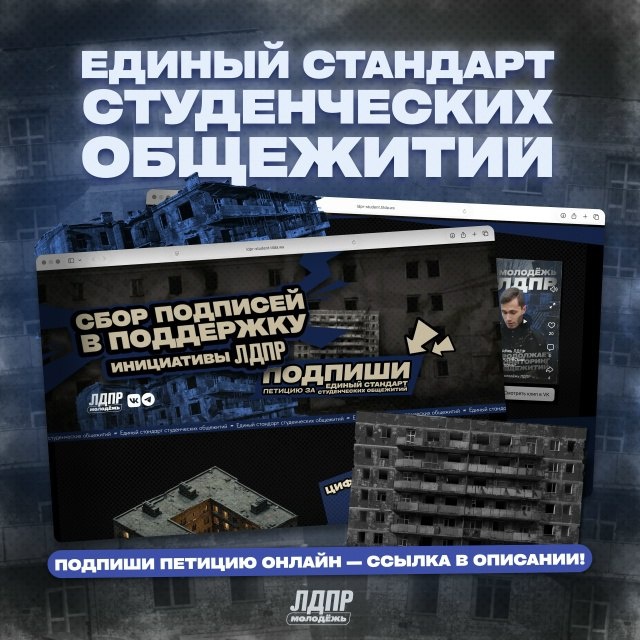 По итогам мониторинга был разработан Единый стандарт студенческих общежитий и мы требуем его закрепления законодательно! Нормальные условия жизни — это обыкновенное уважение к тем, кто учится, работает и развивает нашу страну! 📢 Единый стандарт студенческих общежитий гарантирует три базовых права: 📌 Приравнять Wi Fi к коммунальным услугам и обеспечить 100% покрытие жилых и учебных зон; 📌 Установить минимум 4 розетки на каждое рабочее место и по 1 стиральной машине на 15-20 проживающих; 📌 Плата за проживание в общежитии используется исключительно на ремонт и обслуживание; вводится ежеквартальный публичный отчёт ректора о расходах. 🫵 Чтобы инициатива была обоснованной, мы запустили сбор подписей* за установление Единого стандарта студенческих общежитий — переходи ПО ССЫЛКЕ ldpr-student.tilda.ws и подписывай петицию! *Каждая подпись приближает студента к справедливым условиям проживания и учёбы!
