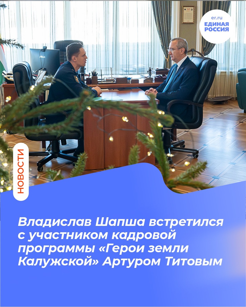 Титов обсудили работу калужского филиала фонда «Защитники Отечества». Титов, участник партийной кадровой программы «Герои земли Калужской», возглавил филиал в июле. Губернатор подчеркнул, что на прошедшей программе «Итоги года» Президент России Владимир Путин уделил особое внимание заботе о бойцах и их семьях. Артур Титов, кавалер ордена Мужества, доложил о решении конкретных вопросов: адаптации жилья для ветеранов, психологической поддержке, трудоустройстве. В пример он привёл историю козельчанина Виталия Игнатьева, который после ранения получил автомобиль и помощь в поиске работы. Владислав Шапша, выступая наставником Артура в рамках программы, пожелал ему успехов и выполнения поручений Президента. #ЕР40 #ЕдинаяРоссия