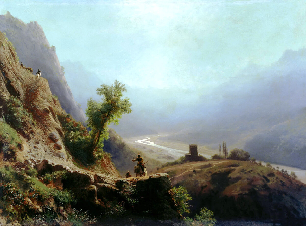 Первое впечатление. Представьте: вы на краю обрыва, вдыхаете чистый горный воздух Кавказа. Лев Феликсович бьет в цель — простор долины, тишина вершин и ощущение полета с высоты склона. Нет суеты, только мощь природы, где человек — кроха в грандиозном мире. Захватывает с первого взгляда! Композиция. Лагорио — блестящий режиссер. Он буквально «за руку» ведет наш взгляд в путешествие: темная скала слева и уступ впереди как кулисы театра обрамляют сцену. Взгляд скользит по S-образной реке вглубь долины, ускоряясь, как на американских горках. Высокая точка обзора усиливает объем — передний план с камнями и кустами детализирован, а фон манит бесконечностью.