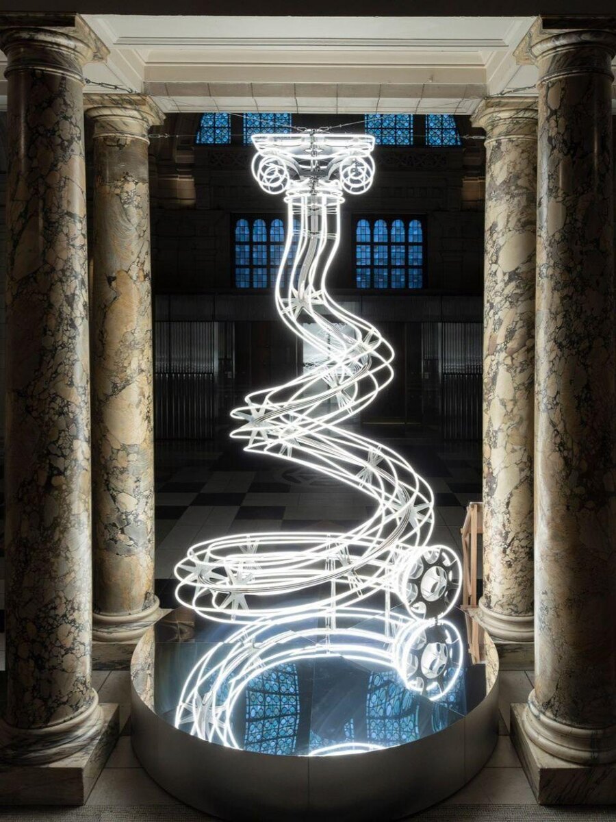 Одной из таких интерпретаций стала работа дизайнера Анны Ломакс — световая елка, установленная в лондонском Музее Виктории и Альберта. Ее форма напрямую связана с архитектурой здания: в основе композиции лежит мотив тосканских колонн, которые украшают парадный вход музея. Конструкция собрана из светодиодных трубок, соединенных металлическими элементами в форме звезд. Завершает инсталляцию дорическая капитель, расположенная на верхушке вместо традиционной рождественской звезды.
