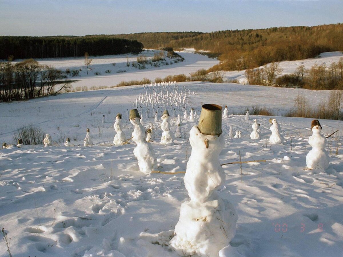 Посреди пустого поля в Николо-Ленивце на берегу Угры возникла армия снеговиков. В реализации идеи художнику помогли местные жители, за что Полисский предложил им по 10 рублей за каждого слепленного «друга».