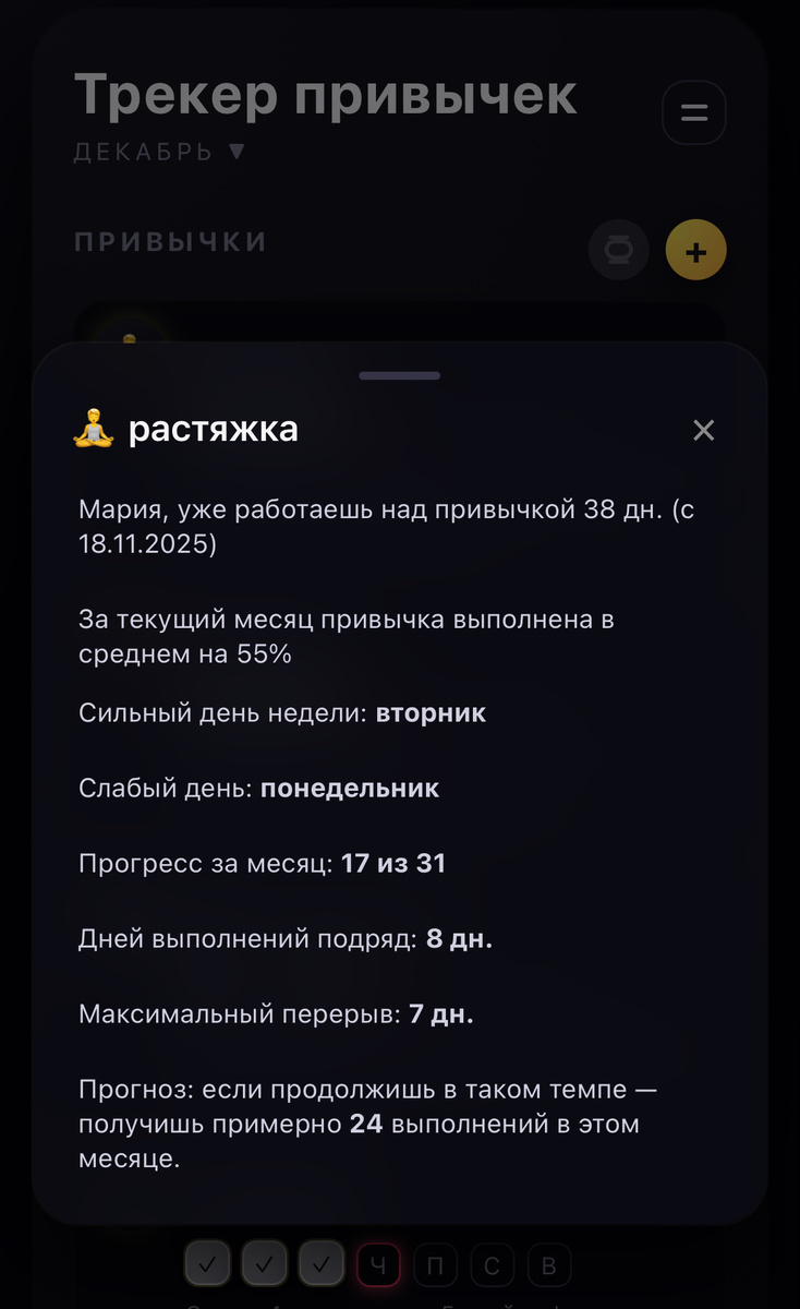 Да потому что: тело зажато, спина ноет, "потом сделаю" длится годами. ПРОБЛЕМА БЫЛА В ТОМ, ЧТО Я НЕ ВИДЕЛА ПРОЦЕССА. сделала привычку Мотивация — штука шумная. Сегодня есть, завтра нет. А трекер: В Mivox мне зашло, что: Если ты тоже начинаешь и бросаешь, устаешь"собираться с силой воли", хочешь мягко и без давления Попробуй вынести привычки из головы — в цифры. Когда видишь процесс, бросать становится сложнее.