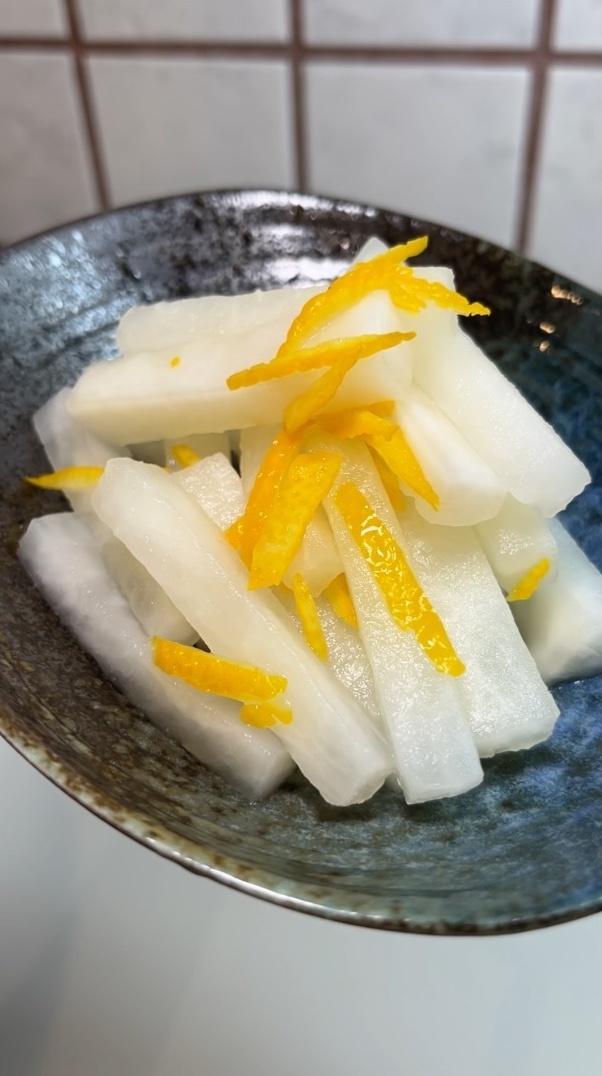 Сок Юдзу / лимона - 1 ст.л. Приготовление: 1. Редьку разрезать на брусочки. 2. Добавить соль и помять немного руками, оставить на 10 минут, затем хорошо отжать. 3. Цитрусовый Юдзу или лимон, отжать сок. 4. Снять цедру с половины цитрусового и нарезать соломкой. 5. Отжатую редьку сложить в пакет, добавить цедру, сахар, уксус, сок Юдзу / лимона. 6. Закрыть пакет, хорошо перемешать и отправить в холодильник на 1 час. Маринованная редька Дайкон готова! Получается вкусно. Ещё больше о том, что едят в Японии на моей странице!