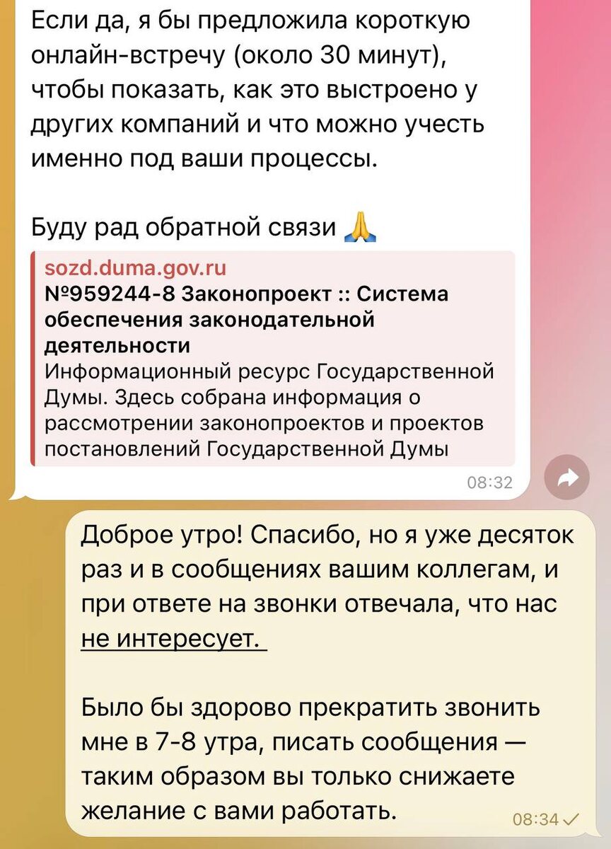 Охх, как я злюсь и ловлю себя на мысли, что самый странный опыт взаимодействия с брендами — это не плохой продукт, а то, как они не умеют принимать «нет». Ты когда-то что-то уточнил, посмотрел предложение, понял, что сейчас не подходит, и нормально об этом сказал. Не исчез, не промолчал, а именно сказал. И вроде бы на этом всё должно закончиться. Но через месяц тебе снова пишут. Потом ещё раз, потом звонят — и так может тянуться годами. Сегодня мне снова начали звонить и писать из компании, с которой я связывала 1+ год назад, и раза 4 точно сказала четкое «нет»👆🏻 👁🗨 С точки зрения маркетинга я правда не понимаю, зачем это делают. Потому что каждый следующий контакт после чёткого отказа не приближает к покупке, а постепенно убивает саму возможность вернуться к этому бренду когда-нибудь позже. Даже если продукт был интересный, даже если цена ок, в голове просто фиксируется: «ребята, которые не слышат». Это ещё и про ощущение границ. Когда компания продолжает писать после нескольк