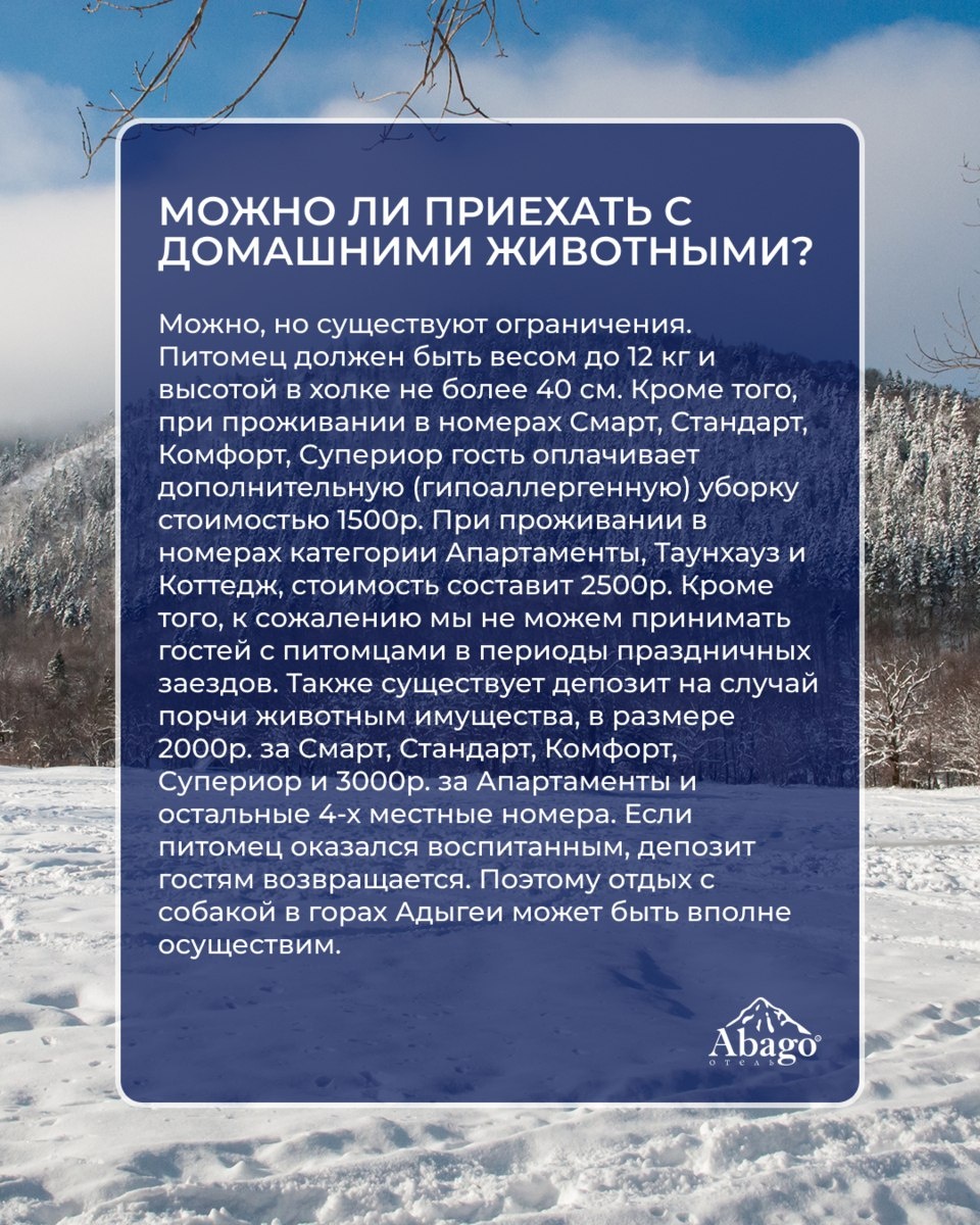 2 ❗ Мы собрали самые частые вопросы, которые возникают у гостей перед бронированием отдыха, и дали на них ответы. Если после просмотра появятся дополнительные вопросы, наши менеджеры всегда на связи и с радостью помогут. Листайте карусель и узнавайте «Абаго» чуть ближе ❄️ А за пределами отеля вас ждут настоящие зимние приключения — санки, снегоходы и вид на заснеженное плато Лаго-Наки, всего в получасе езды. Ждем вас! 😇❄️ 👉 Узнайте все подробности у менеджера по телефону или по ссылкам в закреплённом посте профиля Номер в ЕРОКСТИ «Абаго»: C012024014161