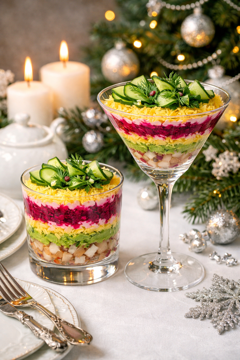 Новогодняя «Шуба» в стакане: нарядный слоёный салат за 10 минут! 🎄🥗
