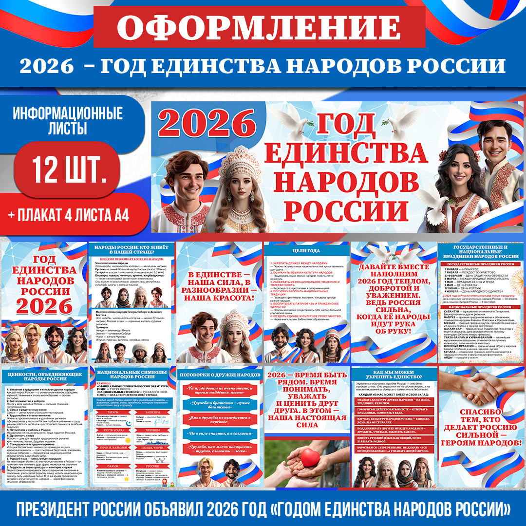 В комплекте представлено: 12 информационных листов + 2 формата баннера — всё, что нужно для яркого и содержательного оформления. Комплект для школы, детского сада, библиотеки или культурного центра — уже собран, структурирован и оформлен в едином стиле.