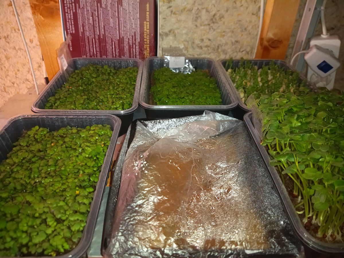 Зима, самое время выращивать микрозелень. Первый опыт с применением джутовых ковриков оказался положительным. Помимо джута, еще необходимы семена, емкости. В качестве емкости используется пластиковый контейнер высотой 4,5 см и контейнер высотой 3,6 см. с отверстиями. Один контейнер вставляется в другой, наливается вода, так, чтобы ее уровень не доставал до низа коврика около 5-10 мм. Коврик также напитываем водой, чтобы он был влажный, но не мокрый. Были посеяны – горчица, дайкон, горох, редис. Все семена за исключением гороха были замочены на 12 часов. Горох замачивался на сутки, за это время промывался 3 раза с полной заменой воды. Далее емкости с посеянными семена помещаются в пакеты, под освещение. Проветривание раз сутки, на 3-й день пакеты убираются. Далее, уход заключается в контроле уровня воды в емкости и опрыскивание водой пару раз в сутки. Подробная инструкция ниже. Можно использовать емкости из-под продуктов, или прикупить и доработать их (в плане вырезки отверстий)
