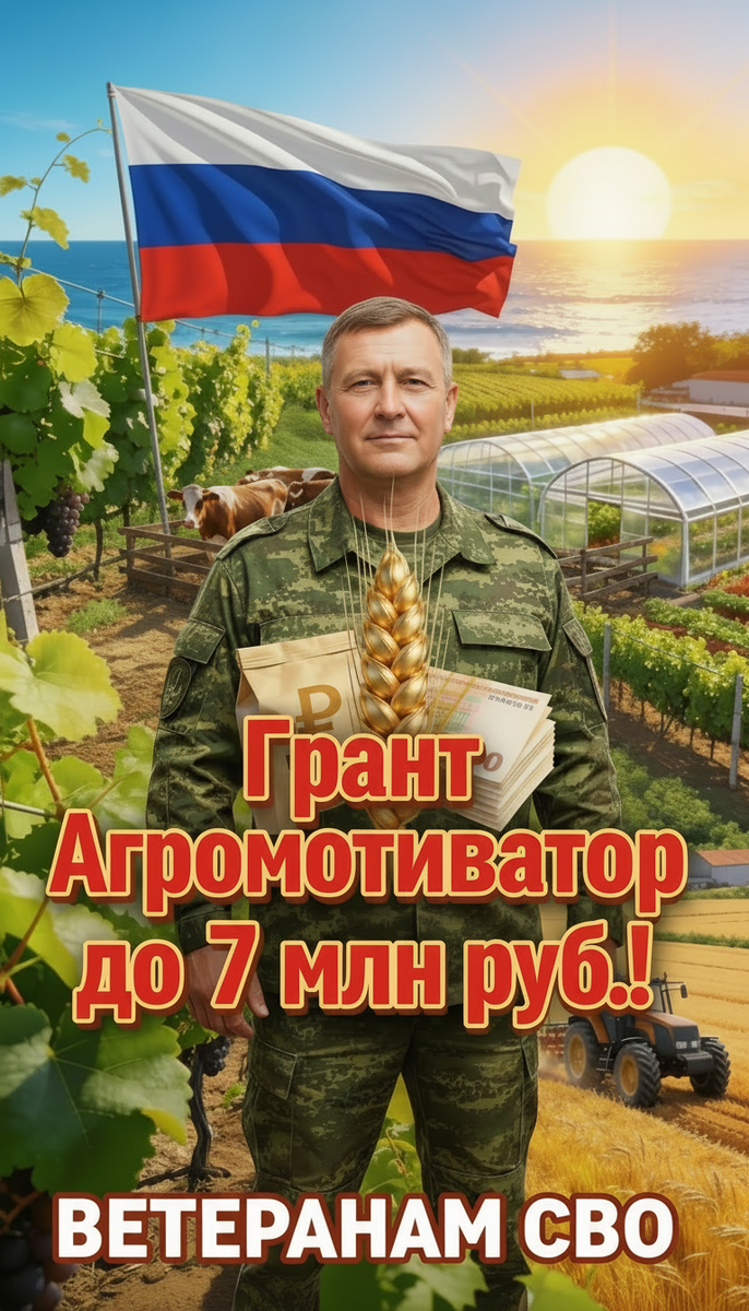 🚨 Братья, у нас замечательное государство. Оно поддерживает каждого, кто вернулся с фронта — помогает встать на ноги, начать новую мирную жизнь и применить свои навыки в деле. После службы многие из нас ищут дело, где важны стойкость, дисциплина, ответственность. В сельском хозяйстве эти качества — золото. И теперь за них государство ещё и платит — через грант «Агромотиватор‑2026». 🚜 Грант «Агромотиватор‑2026» — ферма без кредитов С 2026 года программа работает по всей России, включая ДНР, ЛНР, Запорожскую и Херсонскую области. Грант покрывает до 90% стоимости проекта — максимум **7 млн рублей**, минимум 3 млн. 💰 Гранты и ваша доля