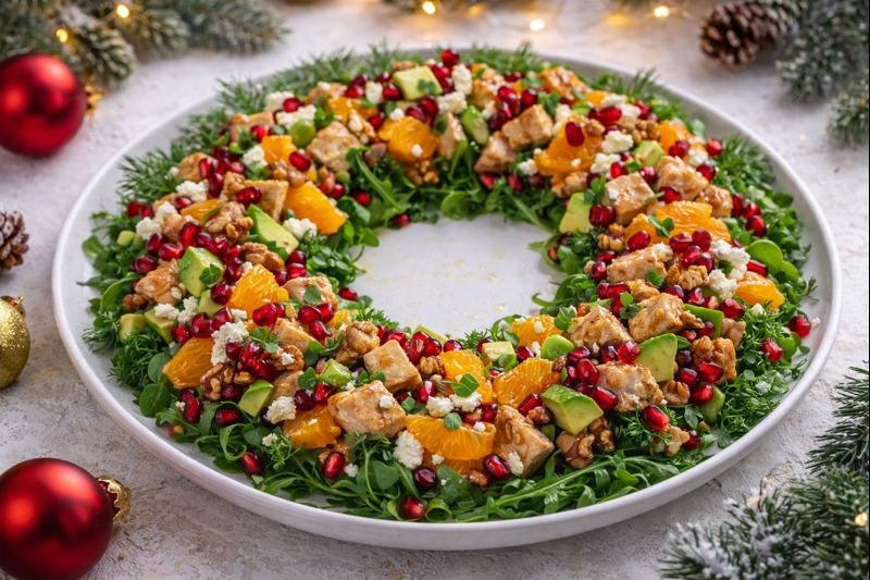 Сочетание сладкого цитруса, граната, нежной курицы, солоноватой феты и орехов. Выглядит празднично и собирается быстро. Время: 20–25 минут (если курица уже готова)